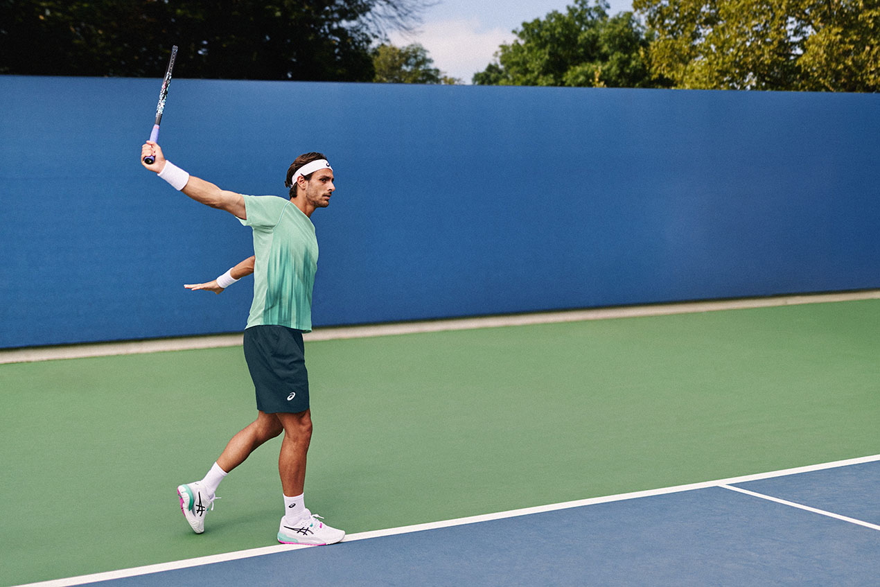 Asics is outfitting sponsored players in the fresh Melbourne Collection, highlighted by the new Solution Speed FF 4 in a white base with accents of light blue and pink. Belinda Bencic leads the Asics contingent on the court with an exclusive match jacquard dress, while Lorenzo Musetti is wearing an exclusive match jacquard short-sleeve shirt to pair with the Melbourne Collection sneaker colorways.