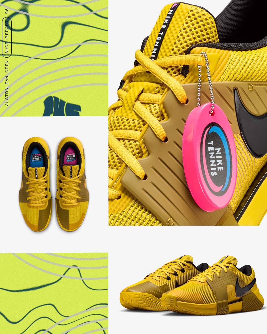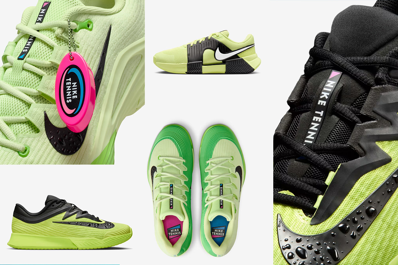 Nike is embracing plenty of color in Melbourne this year, both in the apparel and on the footwear. But the star of show for AO footwear is neon yellow. Star players such as Carlos Alcaraz (Vapor 12), Amanda Anisimova (Vapor Pro 3), and Mirra Andreeva (GP Challenge 1.5) are all in bright yellow shoes, with each sporting Nike’s iconic late 80s “Aqua Gear” branding and embellishments.